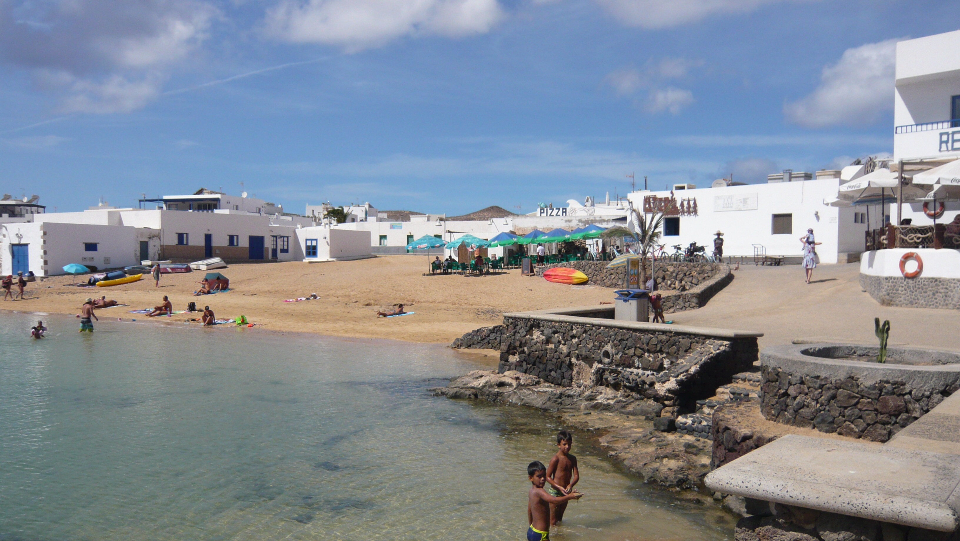 Direkt am Dorfrand befindet sich ein Zeltplatz auf dem ca. 15 Zelte weit auseinander verstreut standen. Direkt vor dem Zeltplatz liegt ein wunderschöner Sandstrand und nirgends ist es überlaufen. Zu dem Zeltplatz gehört ein kleines ovales Gebäude in dem Duschen und WCs untergebracht sind. Das habe ich mir natürlich gleich angesehen und – picobello sauber. Also: Mein Tipp an Hagen und Freunde und andere Menschen die gerne Zelten: Ab in den Flieger nach Lanzarote und mit der Fähre nach La Graciosa mit Zelt und Schlafsack.